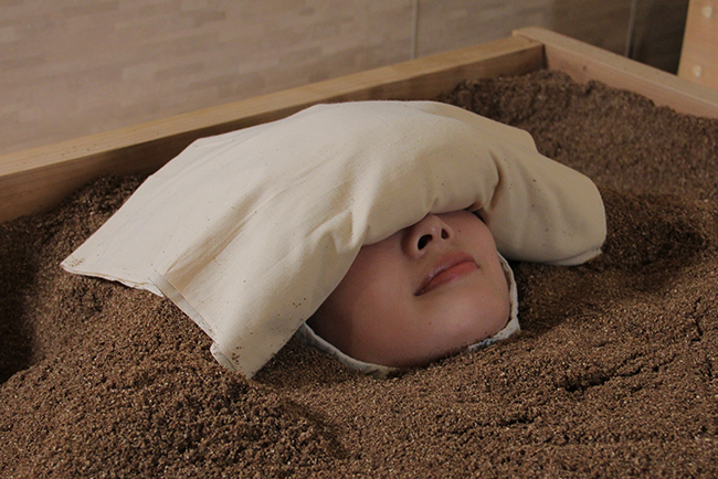 酵素風呂ご入浴の感覚 酵素たっぷりのフカフカのおがくずの中に、専用の酵素浴衣を着て、頭の先から足の先まで全身をすっぽりとうずめます。 それはまるでお母さんのお腹の中にいるような感覚と似ており、ホッとします。 ボナデアの酵素風呂は、うたたねできるぐらいの温かさを基本にしていますので、最初はじんわりと、そして徐々にそのぬくもりが身体に入ってきます。 目元にのせる温かいおがくずタオルが、日々の目の疲れを癒してくれます。ほっとするぬくもりに身をゆだね、全身がリラックスしていきます。