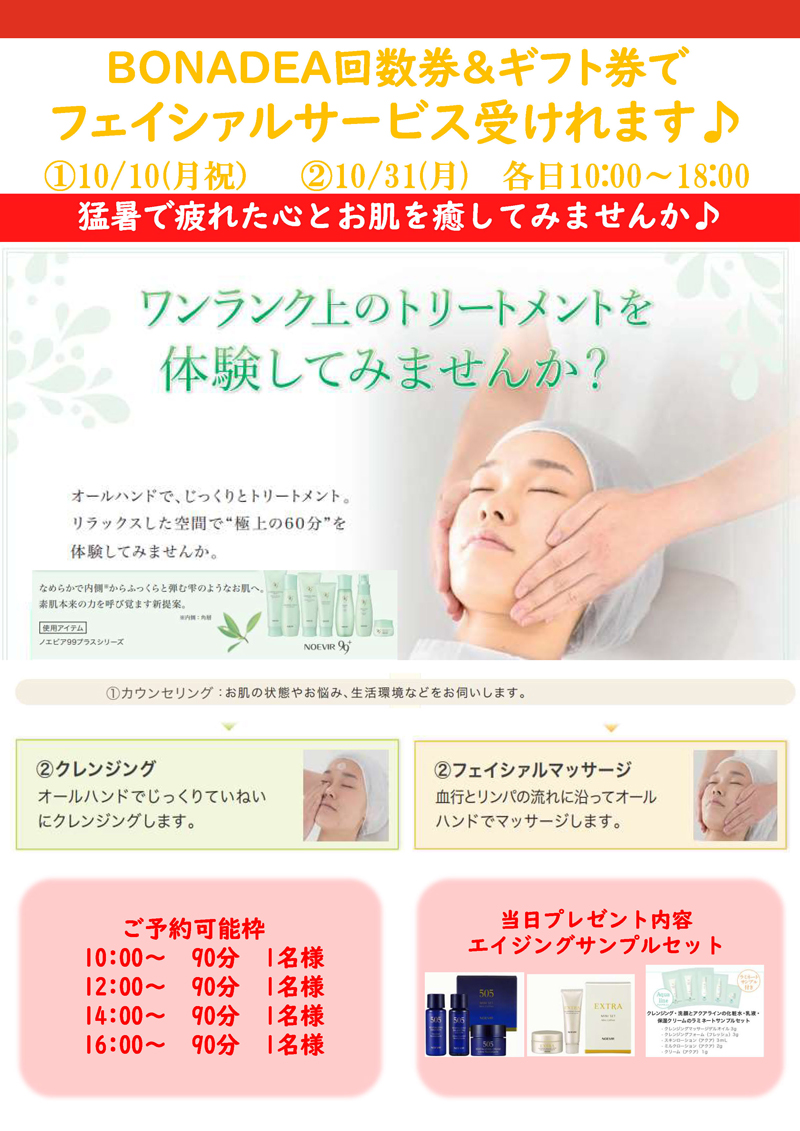 10月店休のお知らせ 2022.09.30 諸事情により10月も下記の通り店休をいただきます。 お客様には大変ご不便をお掛け致しますが何卒ご了承いただきます様、お願い致します。 また、10/10(月祝)、10/31(月)はノエビア社によるフェイシァルサービスデーとなっております。(ボナデアのスタッフはおりません)詳細は別紙をご参照ください。 10月2日(日) 10月3日(月) 10月6日(木) 10月10日(月祝)※ 10月17日(月) 10月24日(月) 10月31日(月)※ 湘南ビーチFMマガジンに掲載されました 前の記事 湘南ビーチFMにゲスト出演してきました 次の記事